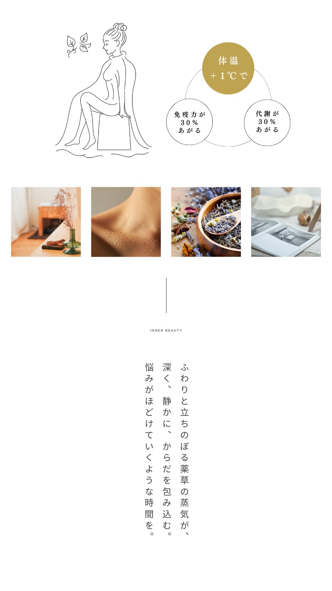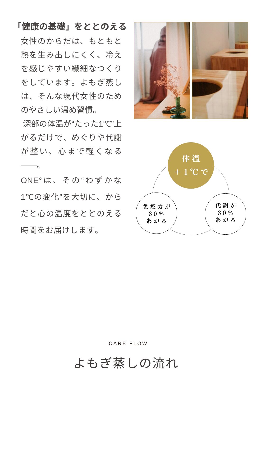 ONE°のよもぎ蒸しは、深部体温を1℃上げることで内側の巡りを整え、体質改善の土台をつくることを目的とした自然素材の温めケアです。