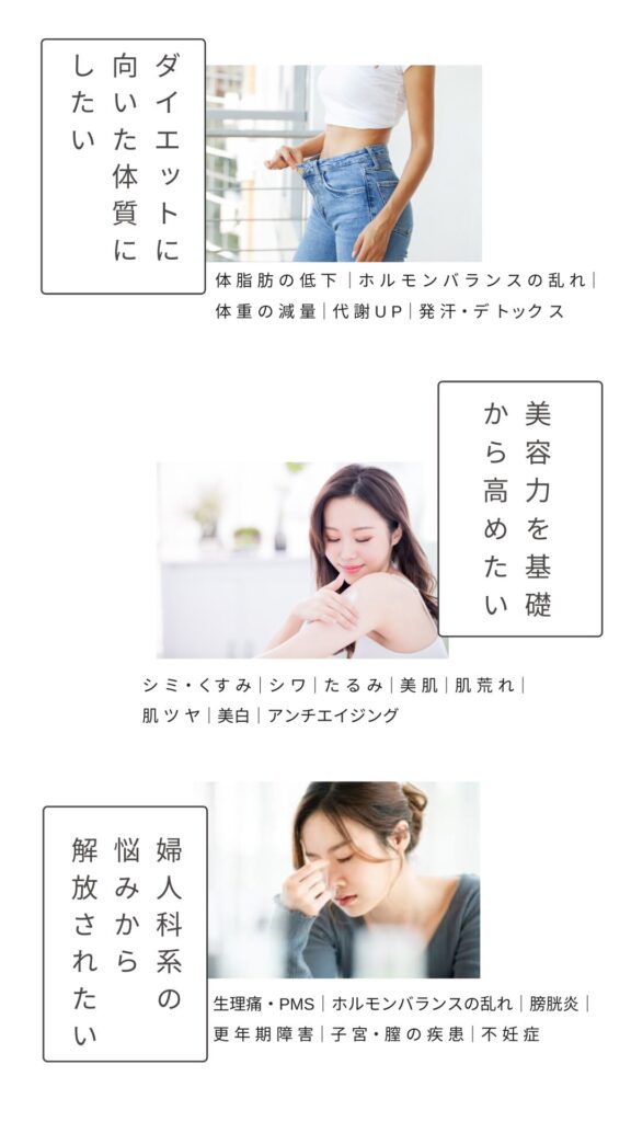 代謝アップやデトックスなど、男性にも認知が広がってきているよもぎ蒸しですが、当店は公衆浴場法の許認可店舗につき、女性限定となっております。カップルや男性の利用を提供しているサロンさまも御座いますので、ぜひ一度体験されることをおすすめいたします。