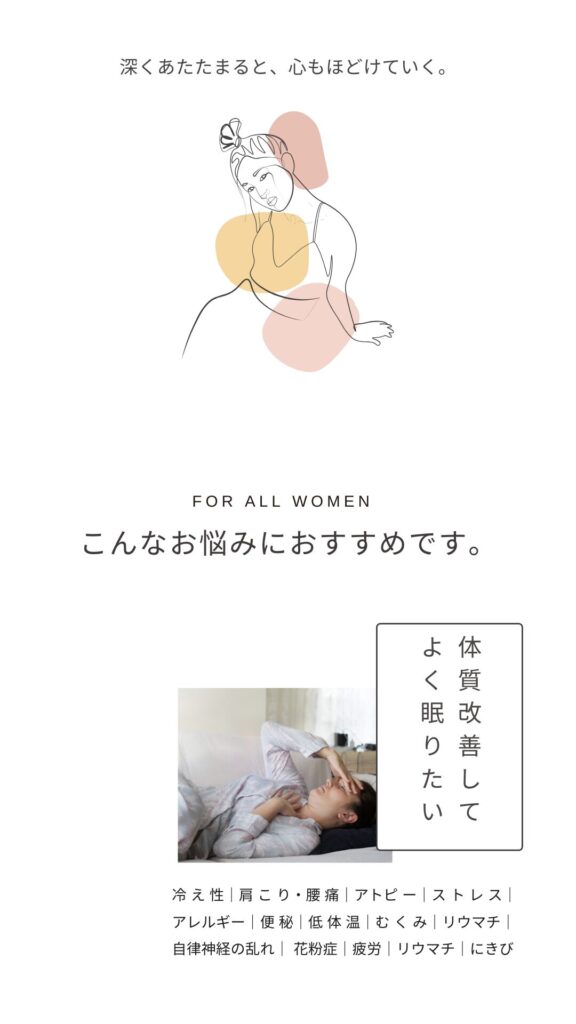 深く温まることで、体内の不要なものを手放す「デトックス力」が高まり、良い栄養や美容成分が届きやすい状態へと導かれます。さらに、体温が上がることで血流が整い、温もりが体の隅々まで巡ります。